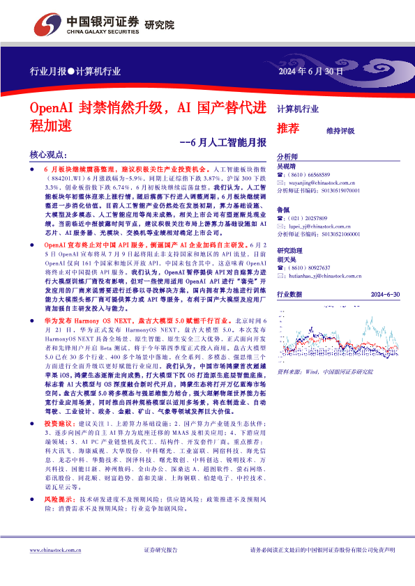 【银河证券】【20240630】6月人工智能月报:OpenAI封禁悄然升级,AI国产替代进程加速-24页