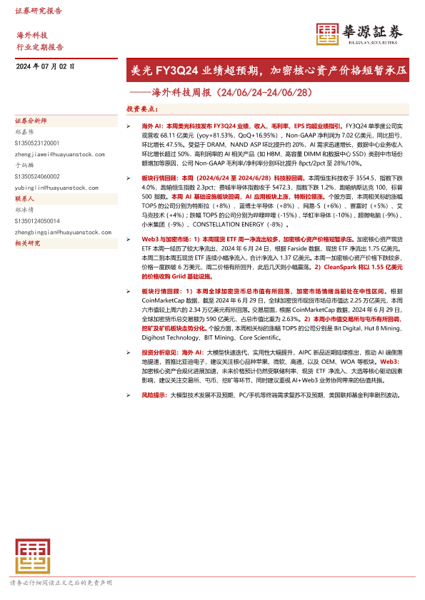 【华源证券】【20240702】海外科技周报:美光FY3Q24业绩超预期,加密核心资产价格短暂承压-13页