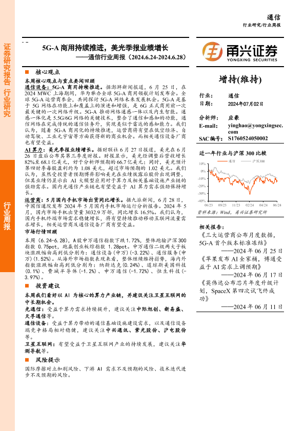 【甬兴证券】【20240702】20240702-甬兴证券-通信行业周报:5G-A商用持续推进,美光季报业绩增长-13页