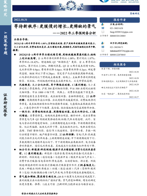 【国泰君安证券】【20221031】等待新秩序:更缓慢的增长,更稀缺的景气——2022年三季报财务分析-21页