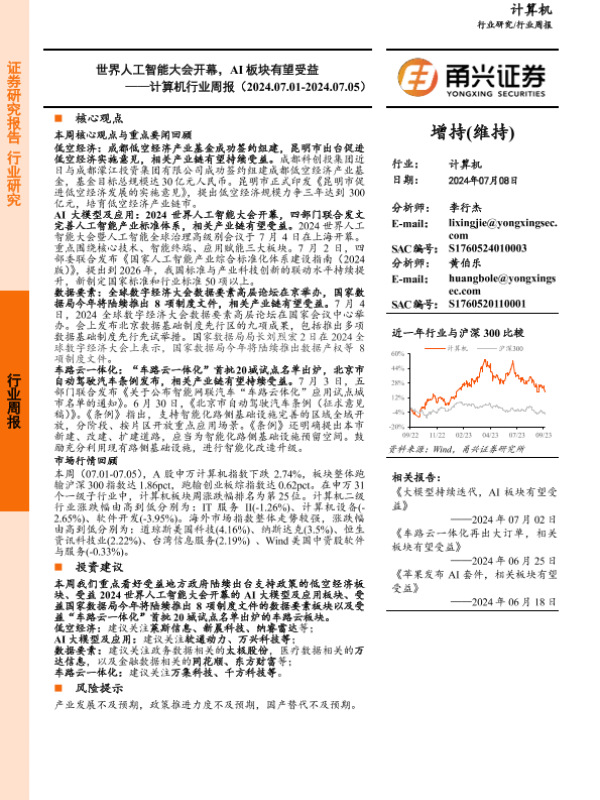 【甬兴证券】【20240708】20240708-甬兴证券-计算机行业周报:世界人工智能大会开幕,AI板块有望受益-15页