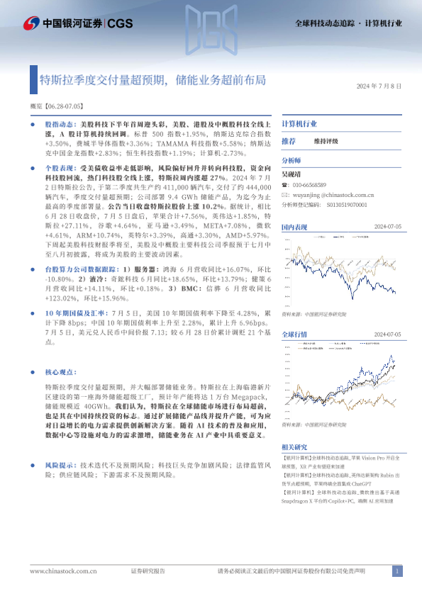 【银河证券】【20240708】全球科技动态追踪·计算机行业:特斯拉季度交付量超预期,储能业务超前布局-10页