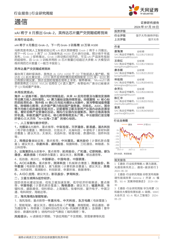 【天风证券】【20240709】20240709-天风证券-通信行业研究周报:xAI将于8月推出Grok-2,英伟达芯片量产交货潮或将到来-10页