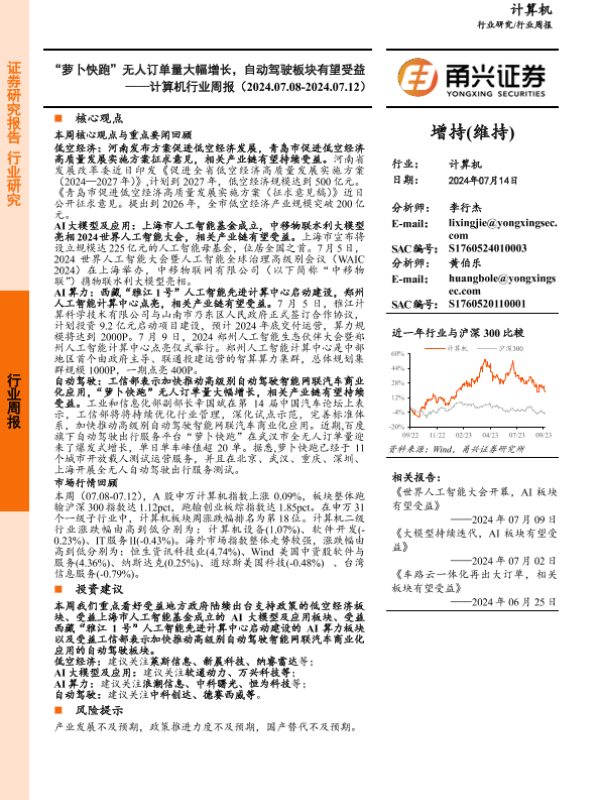 【甬兴证券】【20240714】“萝卜快跑”无人订单量大幅增长,自动驾驶板块有望受益——计算机行业周报(2024.07.08-2024.07.12)-15页