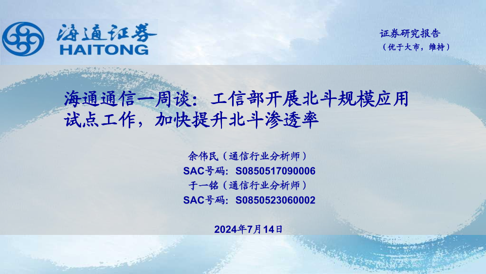 【海通证券】【20240714】海通通信一周谈:工信部开展北斗规模应用试点工作,加快提升北斗渗透率-12页