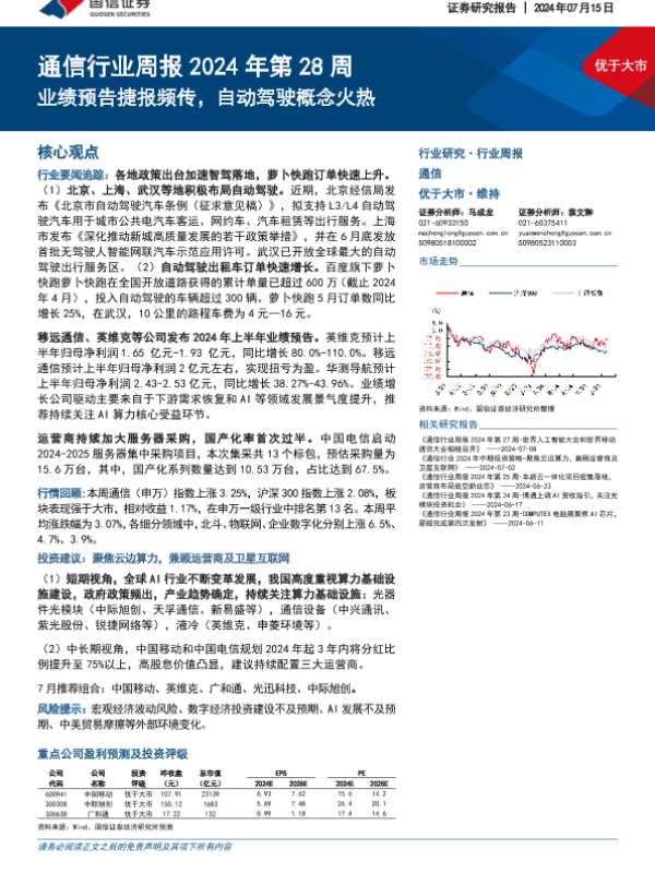 【国信证券】【20240715】2024年第28周通信行业周报:业绩预告捷报频传,自动驾驶概念火热-26页