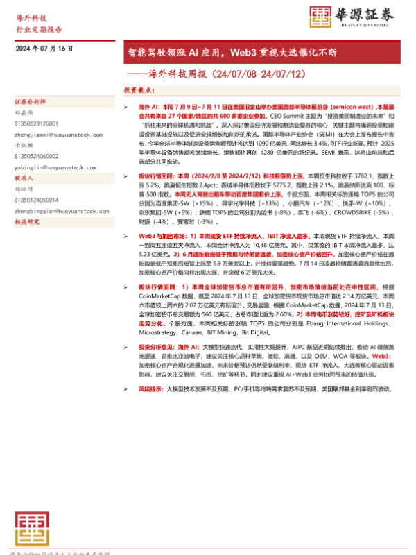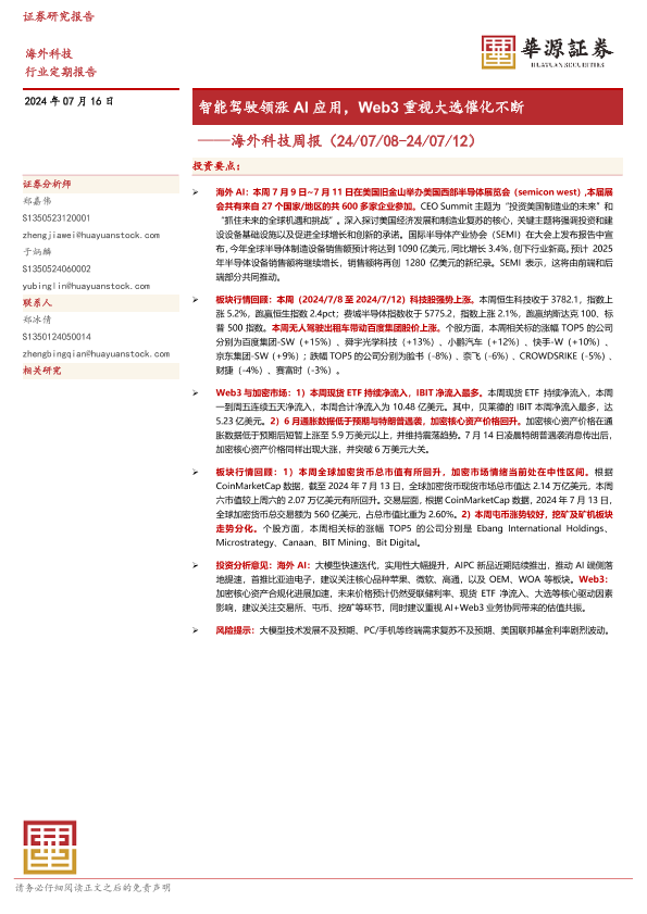 【华源证券】【20240716】海外科技周报:智能驾驶领涨AI应用,Web3重视大选催化不断-12页