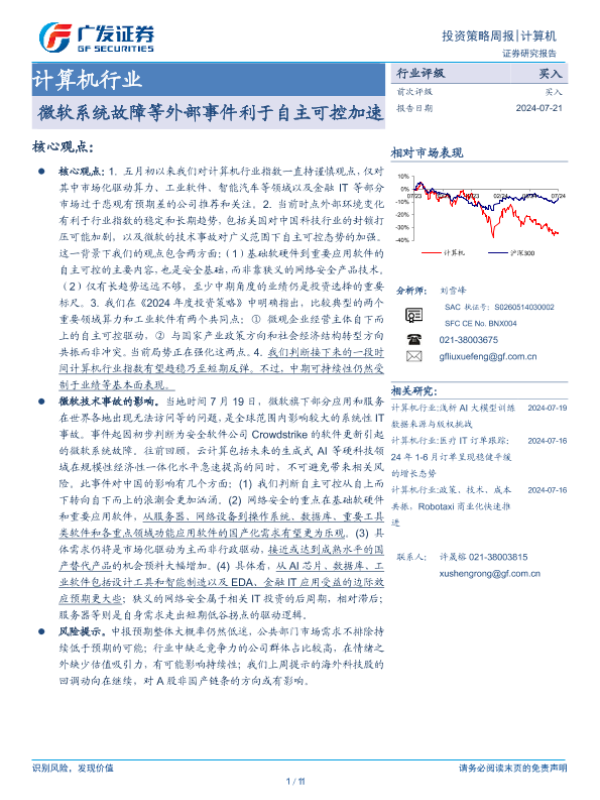 【广发证券】【20240721】20240721-广发证券-计算机行业投资策略周报:微软系统故障等外部事件利于自主可控加速-11页