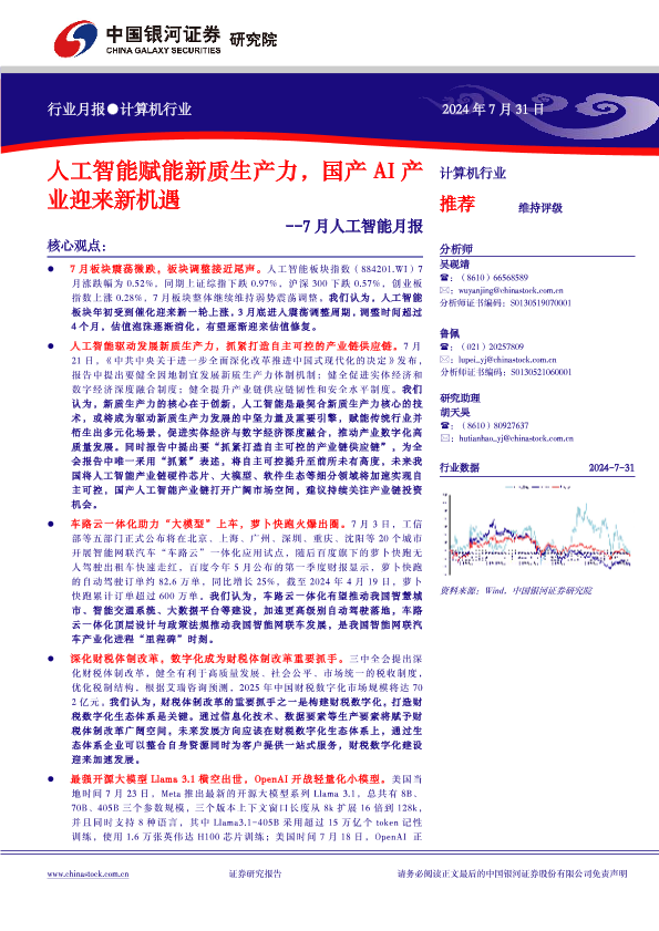【银河证券】【20240731】7月人工智能月报:人工智能赋能新质生产力,国产AI产业迎来新机遇-27页
