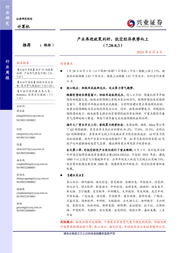 业绩预期 低空经济 政策利好 算力投资 计算机行业