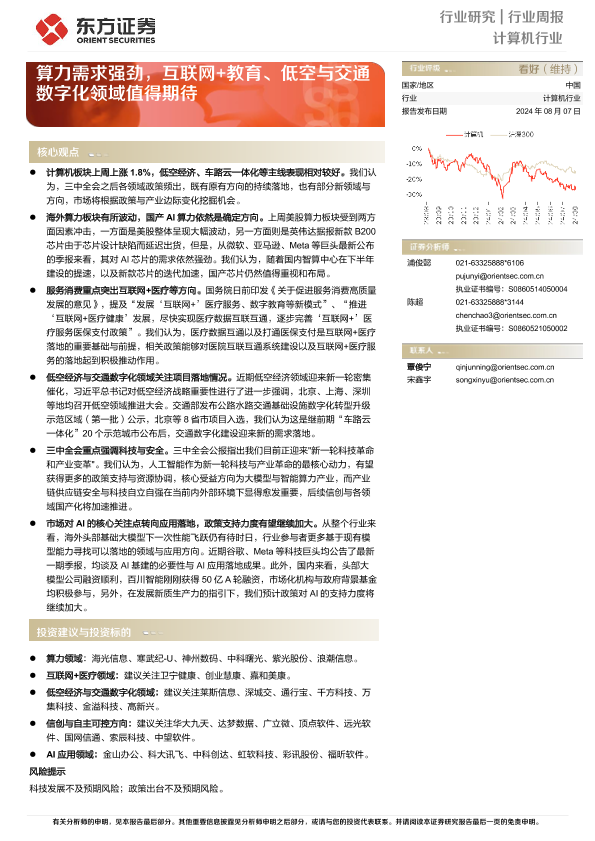 【东方证券】【20240807】20240807-东方证券-计算机行业行业周报:算力需求强劲,互联网+教育、低空与交通数字化领域值得期待-13页