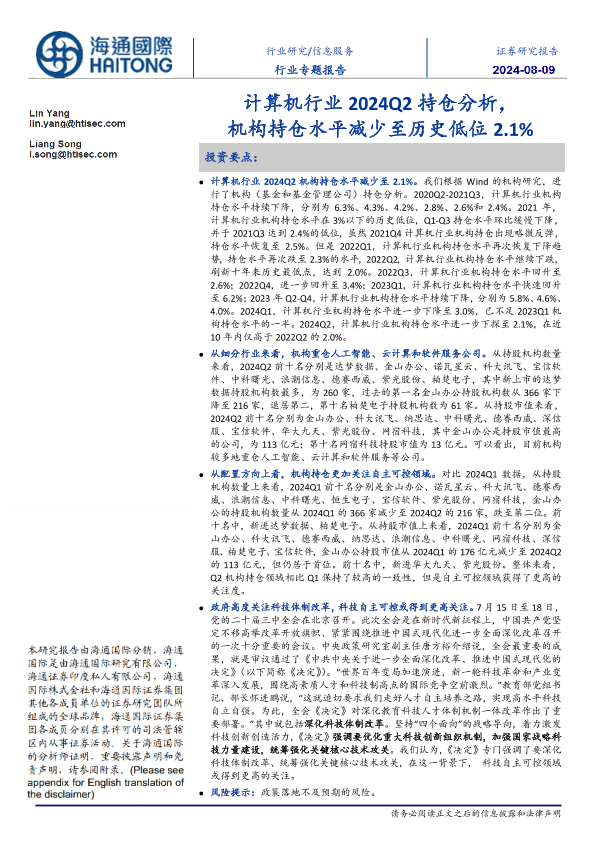 【海通国际】【20240809】20240809-海通国际-信息服务行业专题报告:计算机行业2024Q2持仓分析,机构持仓水平减少至历史低位2.1%-10页