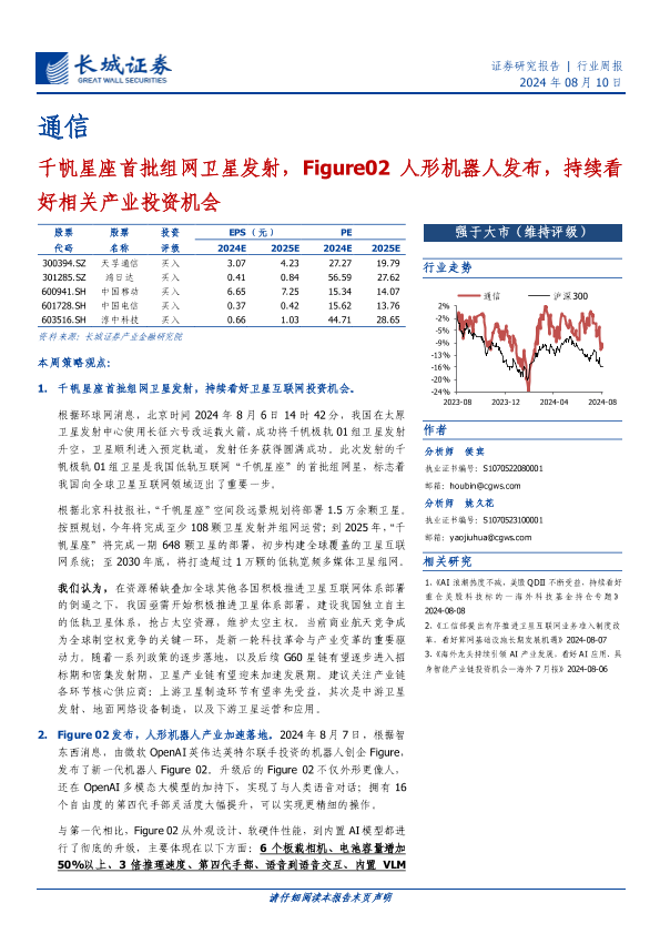 【长城证券】【20240810】20240810-长城证券-通信行业周报:千帆星座首批组网卫星发射,Figure02人形机器人发布,持续看好相关产业投资机会-16页