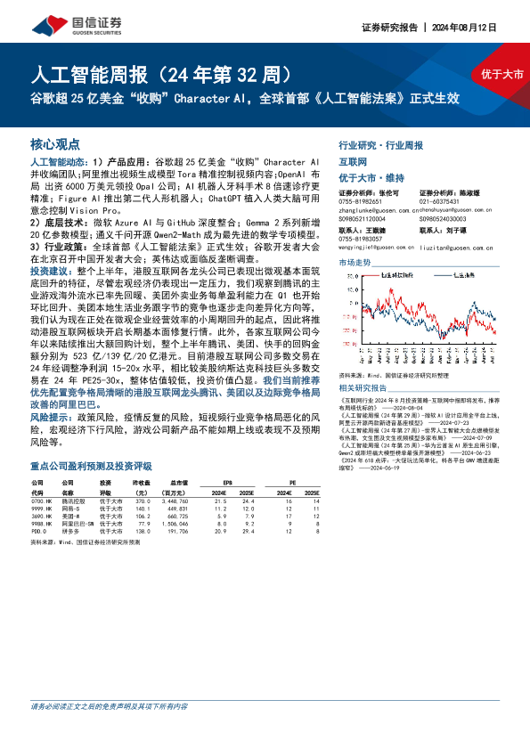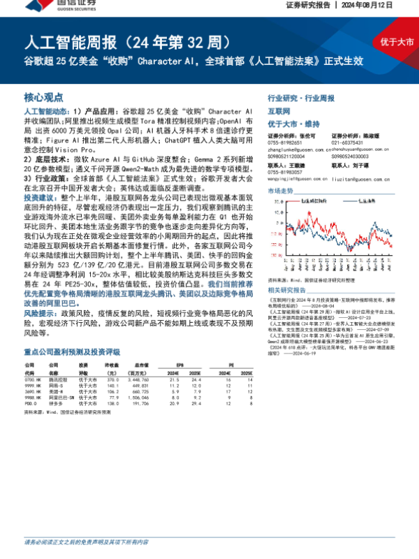 【国信证券】【20240812】20240812-国信证券-人工智能周报(24年第32周):谷歌超25亿美金“收购”Character AI,全球首部《人工智能法案》正式生效-12页