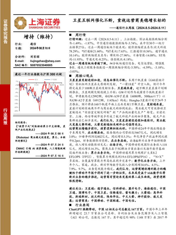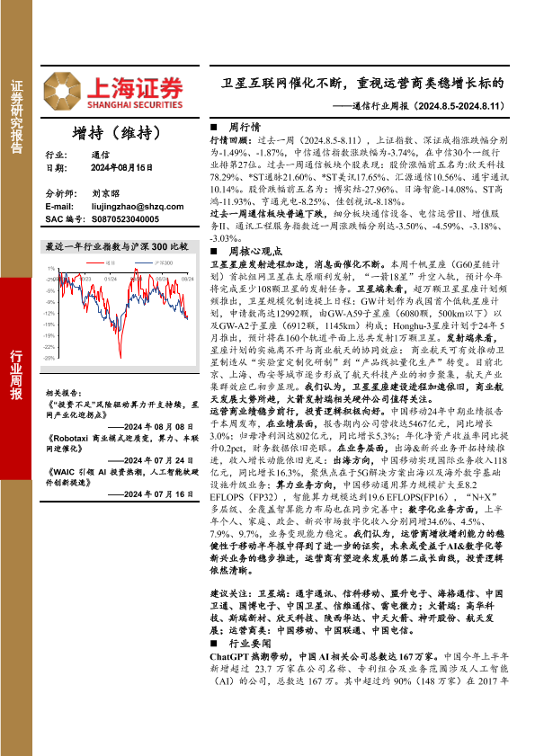 【上海证券】【20240815】通信行业周报:卫星互联网催化不断,重视运营商类稳增长标的-10页