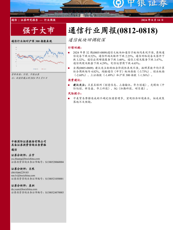 【中银证券】【20240814】20240814-中银证券-通信行业周报:通信板块回调较深-16页