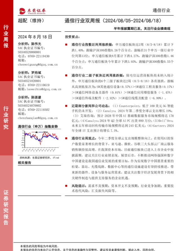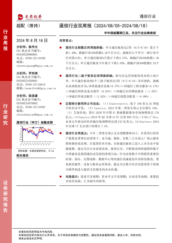 【东莞证券】【20240818】通信行业双周报:半年报披露期已至,关注行业业绩表现-12页