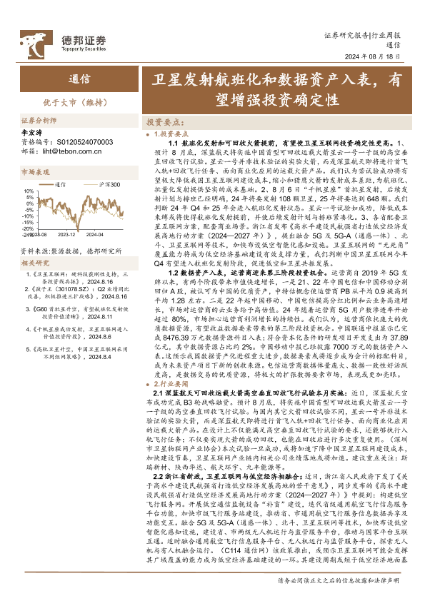 【德邦证券】【20240818】通信行业周报:卫星发射航班化和数据资产入表,有望增强投资确定性-18页