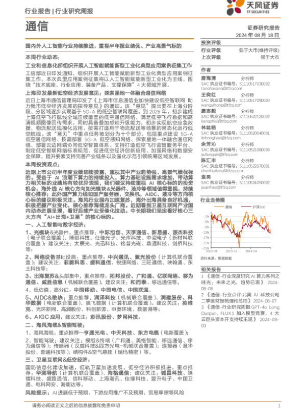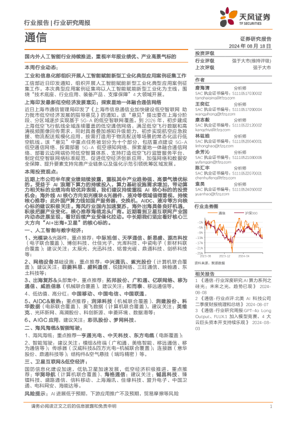 【天风证券】【20240818】通信行业研究周报:国内外人工智能行业持续推进,重视半年报业绩优、产业高景气标的-11页