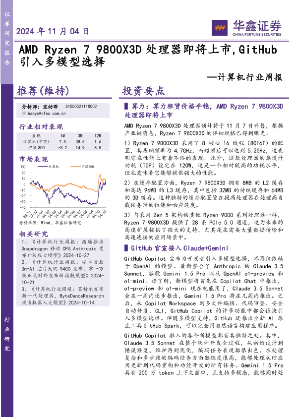 【华鑫证券】【20241104】20241104-华鑫证券-计算机行业周报:AMD Ryzen 7 9800X3D处理器即将上市,GitHub引入多模型选择-16页