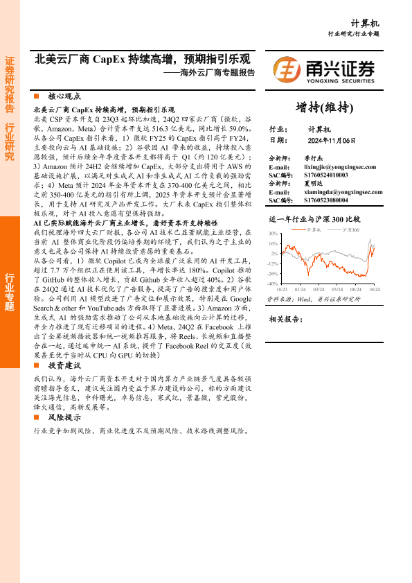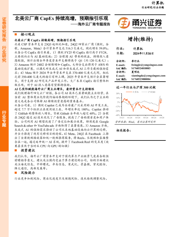 【甬兴证券】【20241106】20241106-甬兴证券-计算机行业海外云厂商专题报告:北美云厂商CapEx持续高增,预期指引乐观-15页