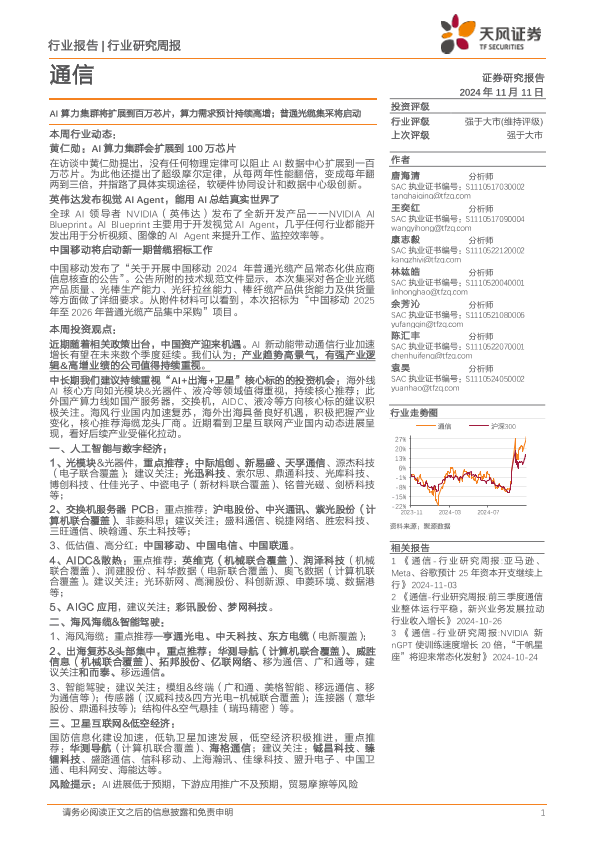 【天风证券】【20241111】通信行业研究周报:AI算力集群将扩展到百万芯片,算力需求预计持续高增;普通光缆集采将启动-15页