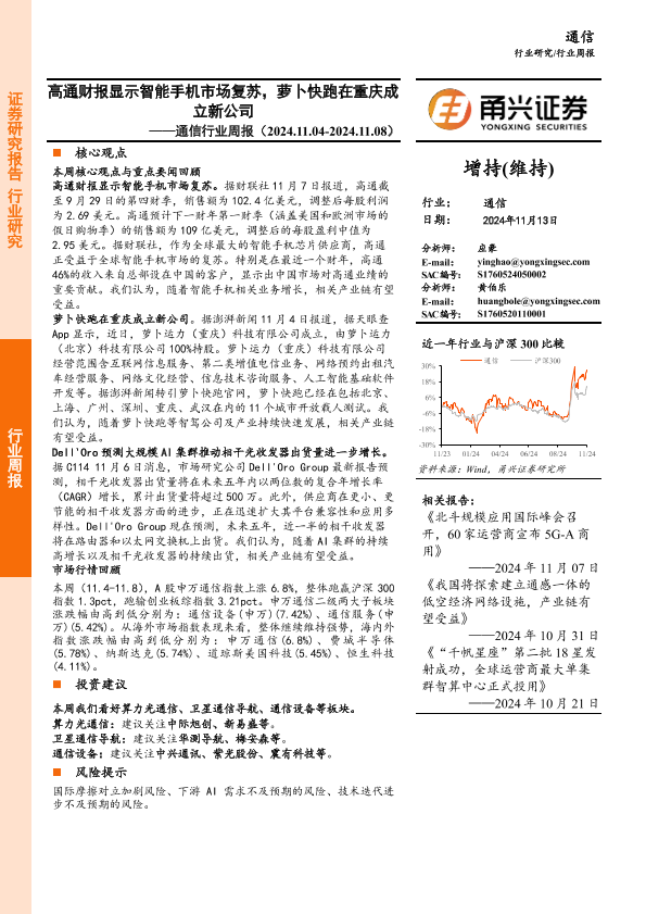 【甬兴证券】【20241113】通信行业周报:高通财报显示智能手机市场复苏,萝卜快跑在重庆成立新公司-12页