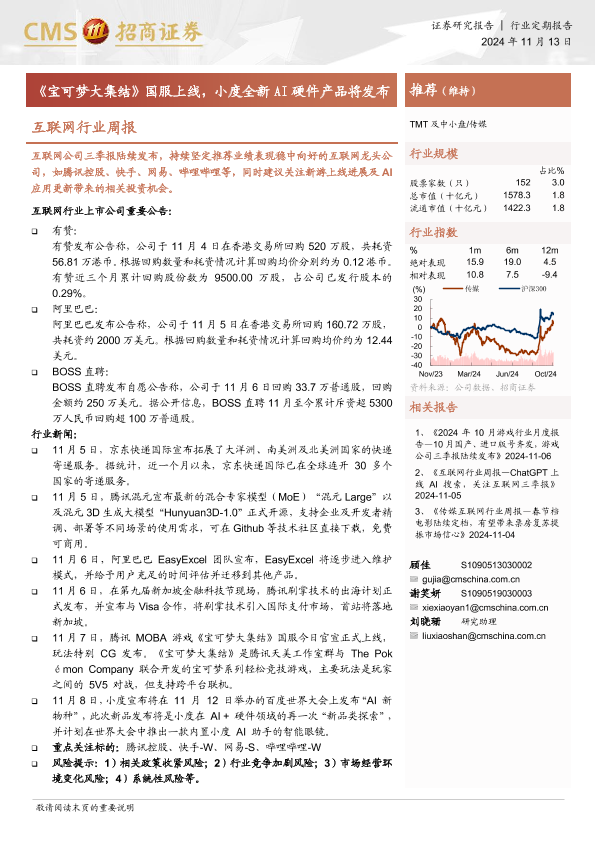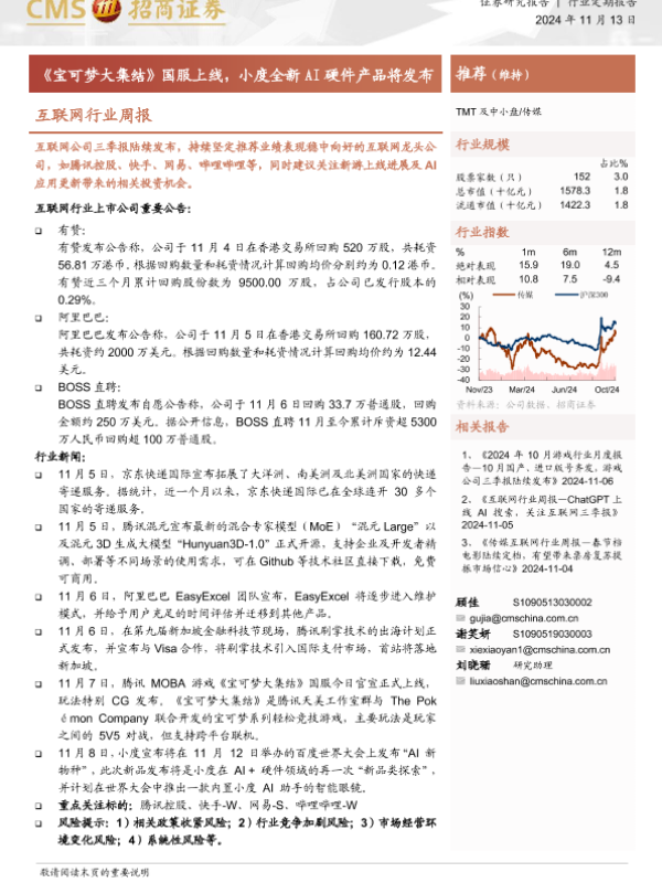 【海通证券】【20241113】20241113-招商证券-互联网行业周报:《宝可梦大集结》国服上线,小度全新AI硬件产品将发布-10页