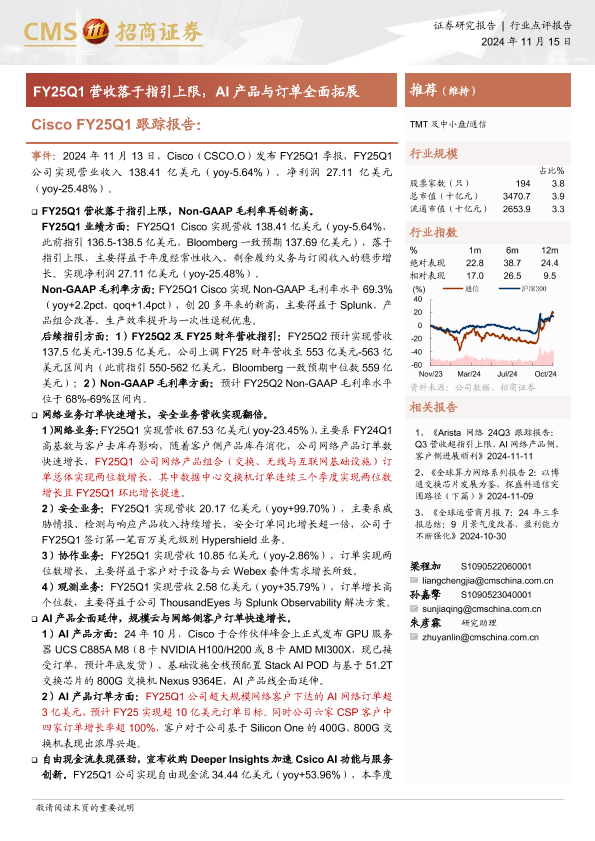 【海通证券】【20241115】Cisco FY25Q1跟踪报告:FY25Q1营收落于指引上限,AI产品与订单全面拓展-11页