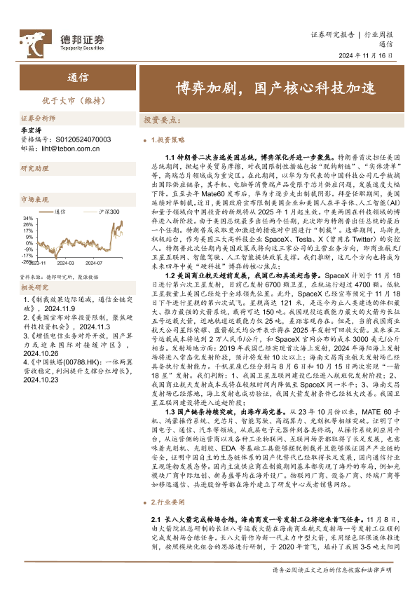 【德邦证券】【20241116】20241116-德邦证券-通信行业周报:博弈加剧,国产核心科技加速-20页