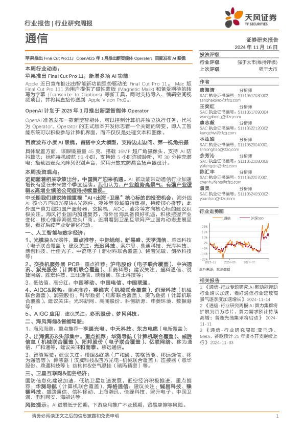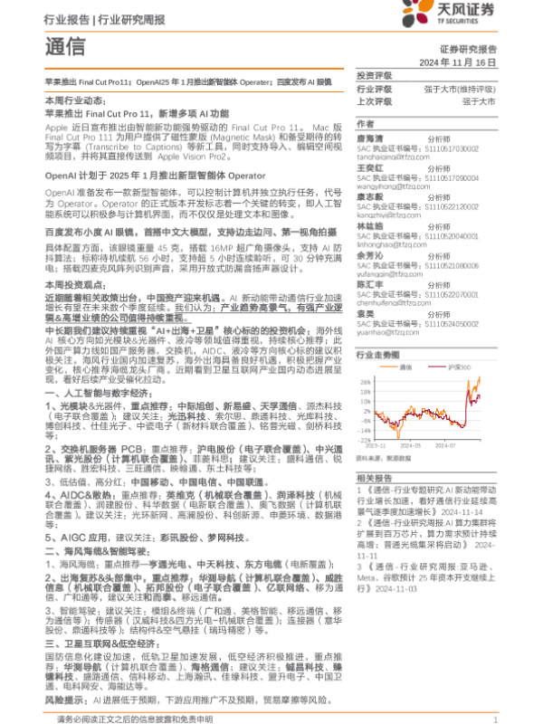 【天风证券】【20241116】通信行业研究周报:苹果推出Final Cut Pro11;OpenAI25年1月推出新智能体Operater;百度发布AI眼镜-13页