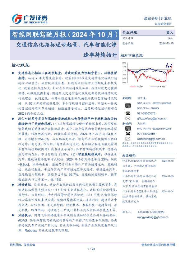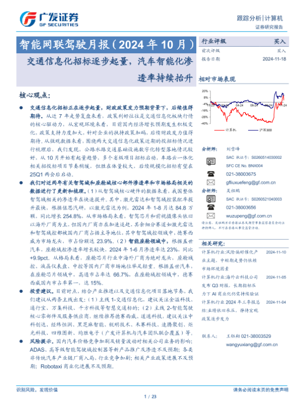 【广发证券】【20241118】智能网联驾驶月报(2024年10月):交通信息化招标逐步起量,汽车智能化渗透率持续抬升-23页