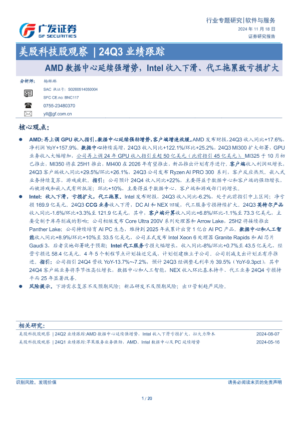 【广发证券】【20241118】美股科技股观察 24Q3业绩跟踪:AMD数据中心延续强增势,Intel收入下滑、代工拖累致亏损扩大-20页