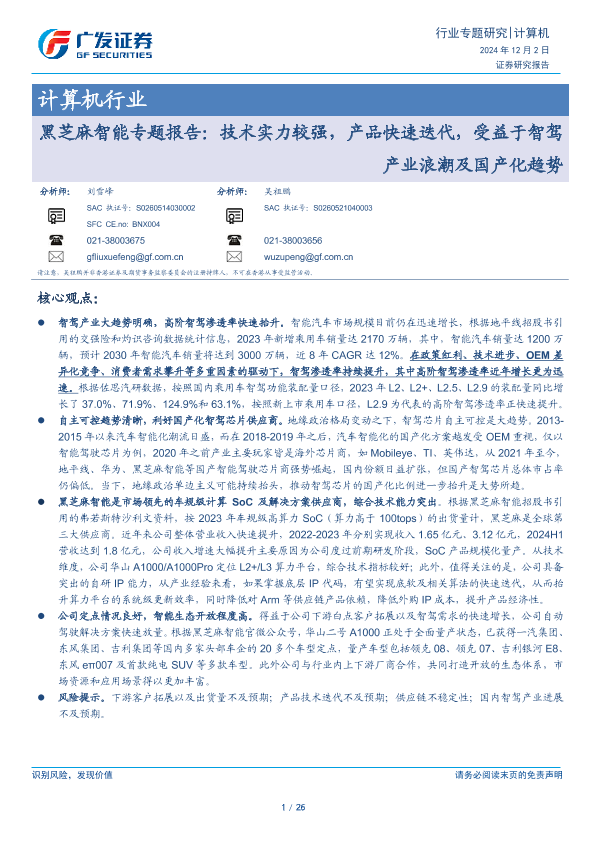 【广发证券】【20241202】黑芝麻智能专题报告:技术实力较强,产品快速迭代,受益于智驾产业浪潮及国产化趋势-26页