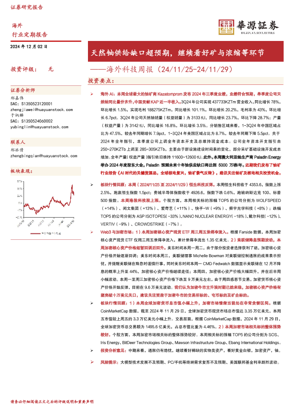 【华源证券】【20241202】海外科技周报:天然铀供给缺口超预期,继续看好矿与浓缩等环节-14页