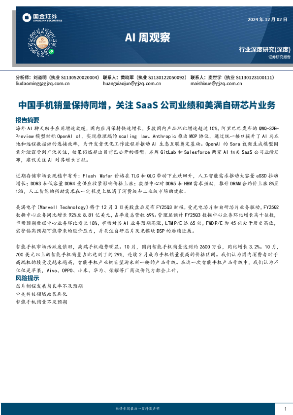 【国金证券】【20241202】AI周观察:中国手机销量保持同增,关注SaaS公司业绩和美满自研芯片业务-11页