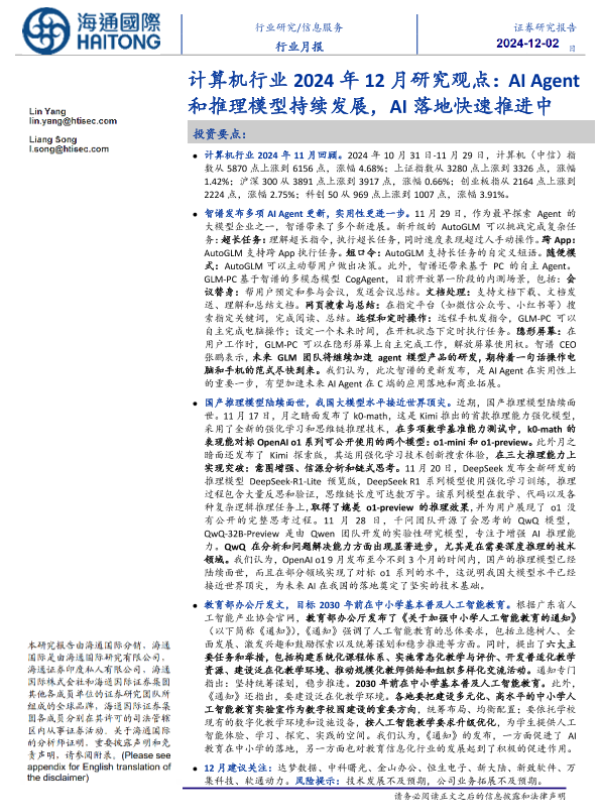 【海通国际】【20241201】计算机行业2024年12月研究观点:AI Agent和推理模型持续发展,AI落地快速推进中-11页