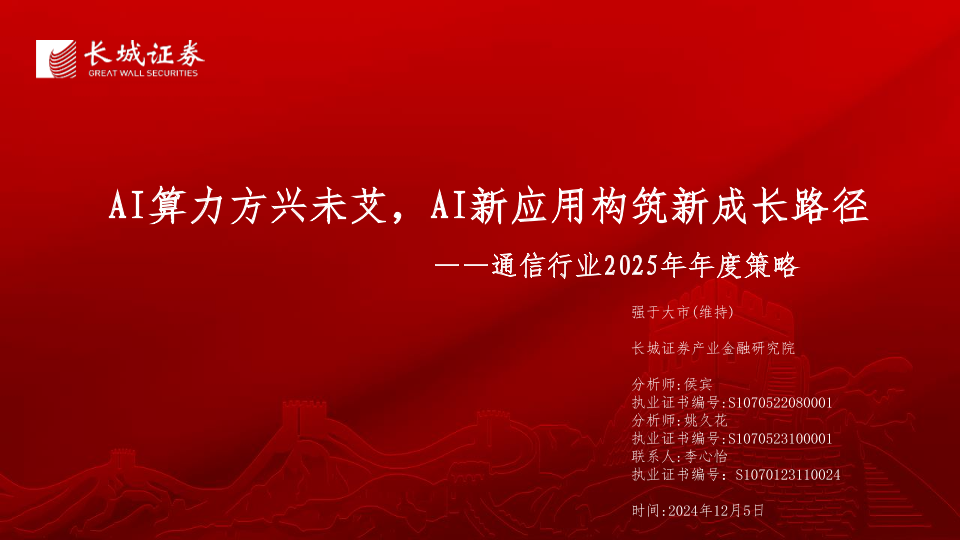 【长城证券】【20241205】AI算力方兴未艾,AI新应用构筑新成长路径——通信行业2025年年度策略-59页
