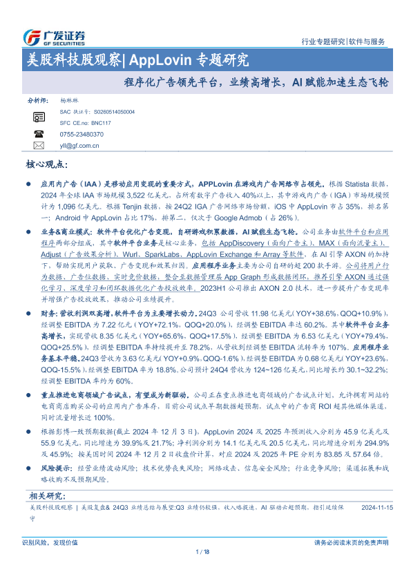 【广发证券】【20241209】美股科技股观察 AppLovin专题研究:程序化广告领先平台,业绩高增长,AI赋能加速生态飞轮-18页