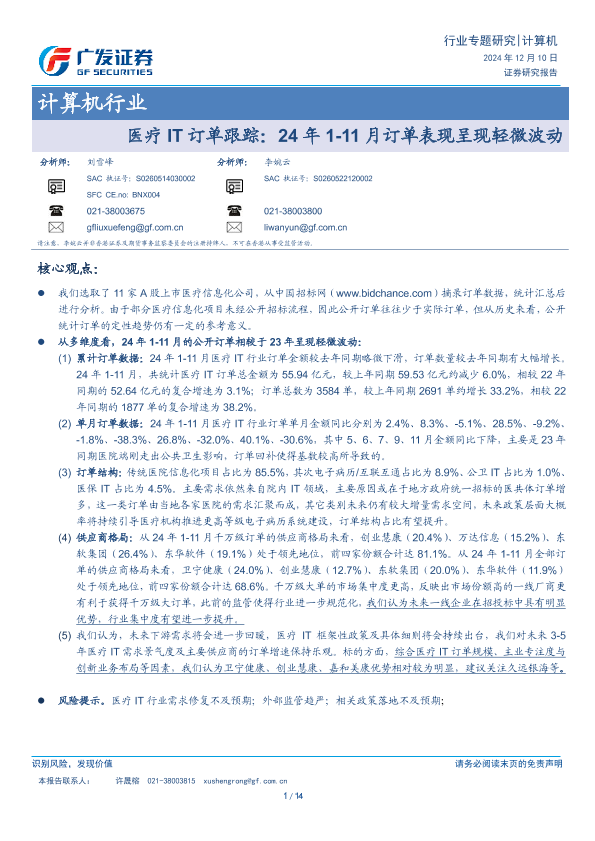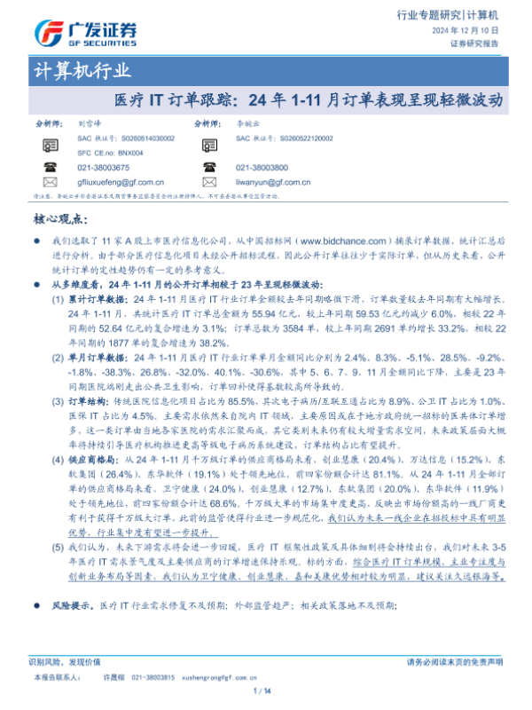 【广发证券】【20241210】医疗IT订单跟踪:24年1-11月订单表现呈现轻微波动-14页
