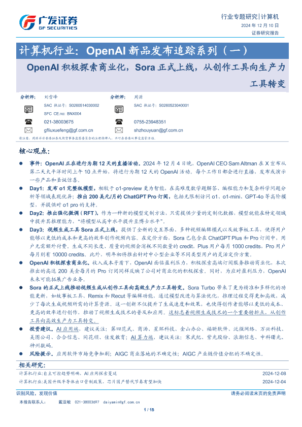 【广发证券】【20241210】计算机行业:OpenAI新品发布追踪系列(一):OpenAI积极探索商业化,Sora正式上线,从创作工具向生产力工具转变-15页