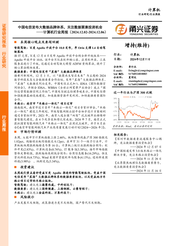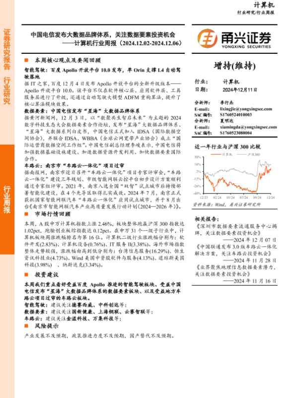 【甬兴证券】【20241211】20241211-甬兴证券-计算机行业周报:中国电信发布大数据品牌体系,关注数据要素投资机会-10页