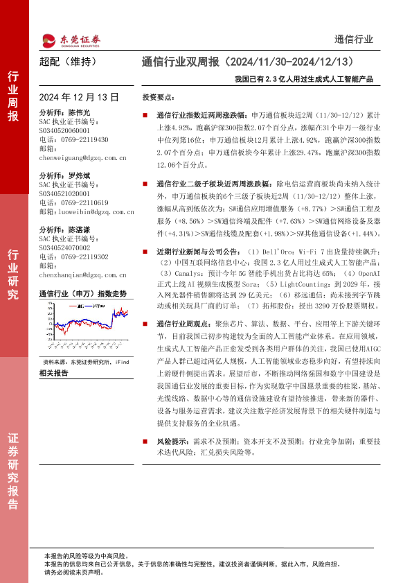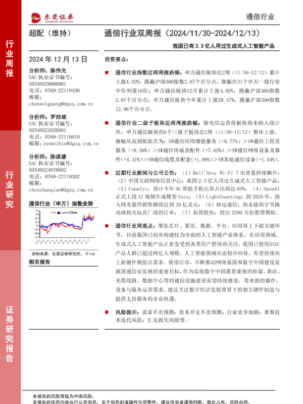 【东莞证券】【20241213】通信行业双周报:我国已有2.3亿人用过生成式人工智能产品-12页