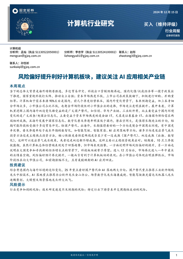 【国金证券】【20241215】20241215-国金证券-计算机行业研究:风险偏好提升利好计算机板块,建议关注AI应用相关产业链-14页