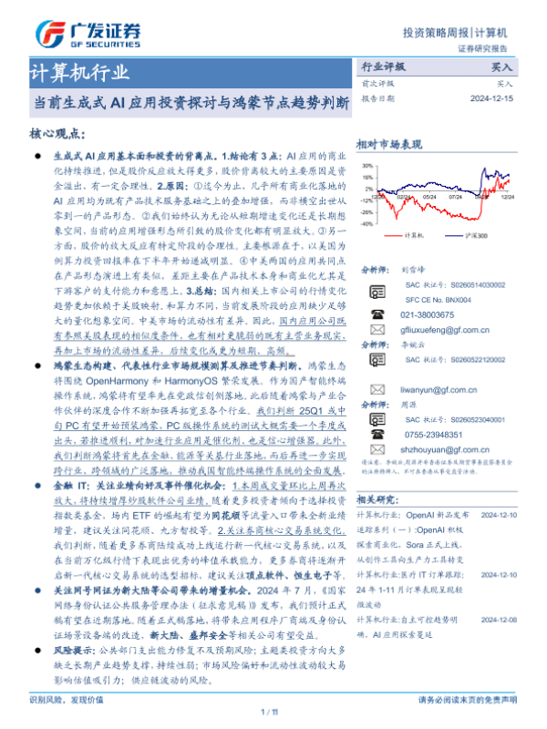 【广发证券】【20241215】20241215-广发证券-计算机行业投资策略周报:当前生成式AI应用投资探讨与鸿蒙节点趋势判断-11页