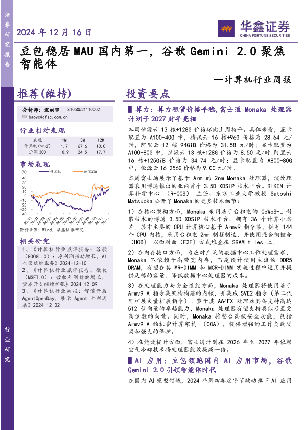 AI应用 富士通Monaka处理器 算力租赁 谷歌Gemini2.0 计算机行业