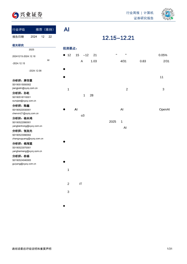 【兴业证券】【20241222】20241222-兴业证券-计算机行业周报:AI产业跟踪:鲶鱼效应发酵,产业催化密集-31页