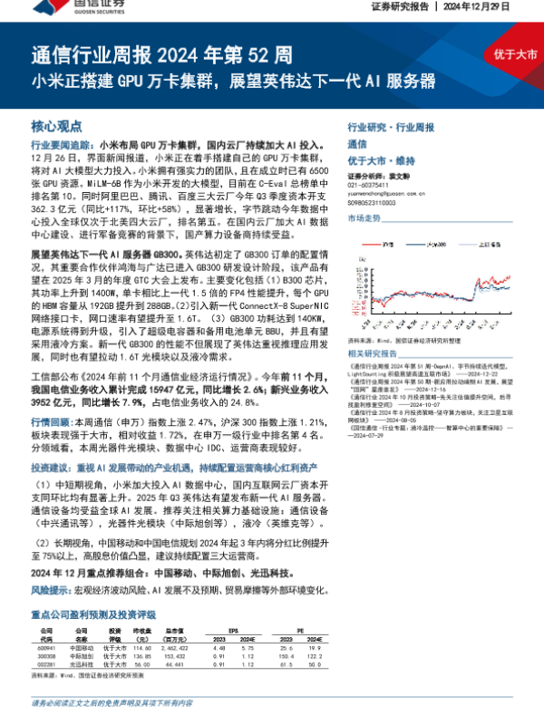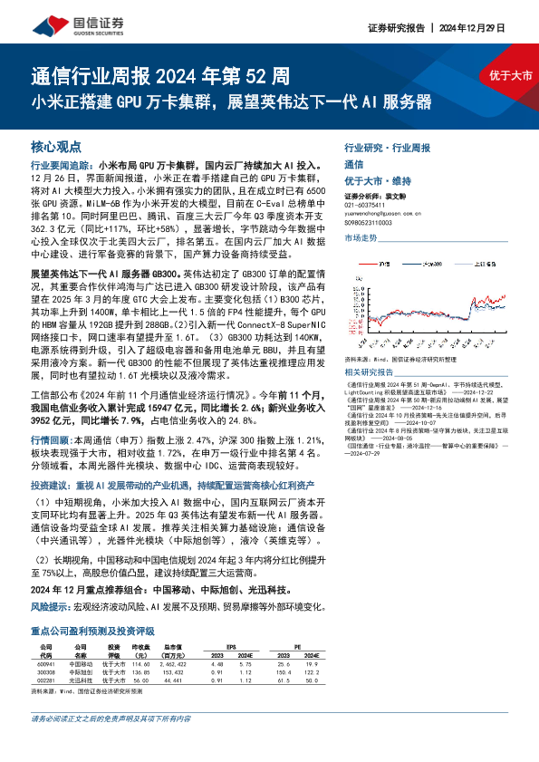 【国信证券】【20241229】通信行业周报2024年第52周:小米正搭建GPU万卡集群,展望英伟达下一代AI服务器-17页