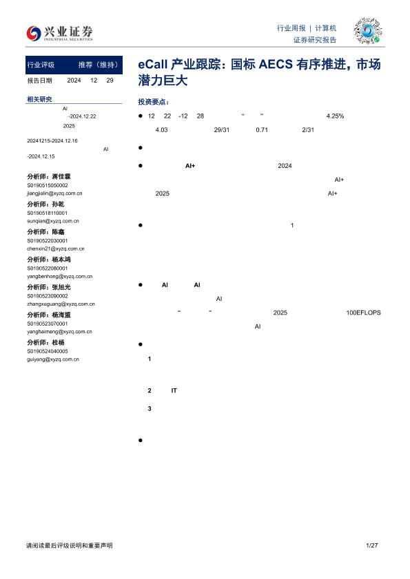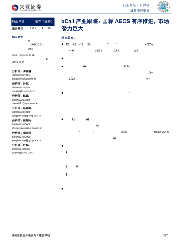 【兴业证券】【20241229】eCall产业跟踪:国标AECS有序推进,市场潜力巨大-27页