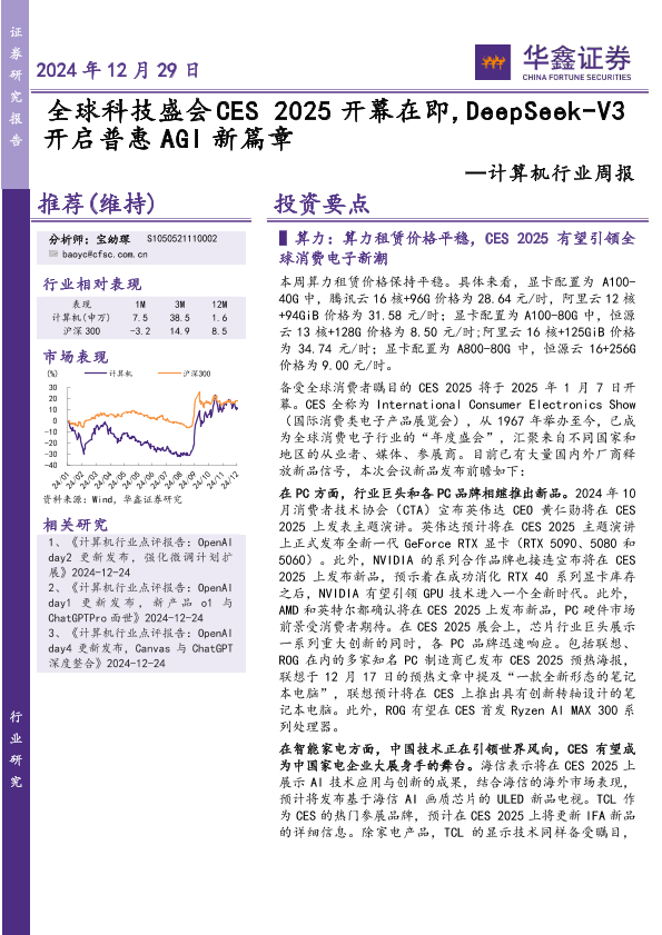 AGI CES 2025 DeepSeek-V3 算力租赁 计算机行业